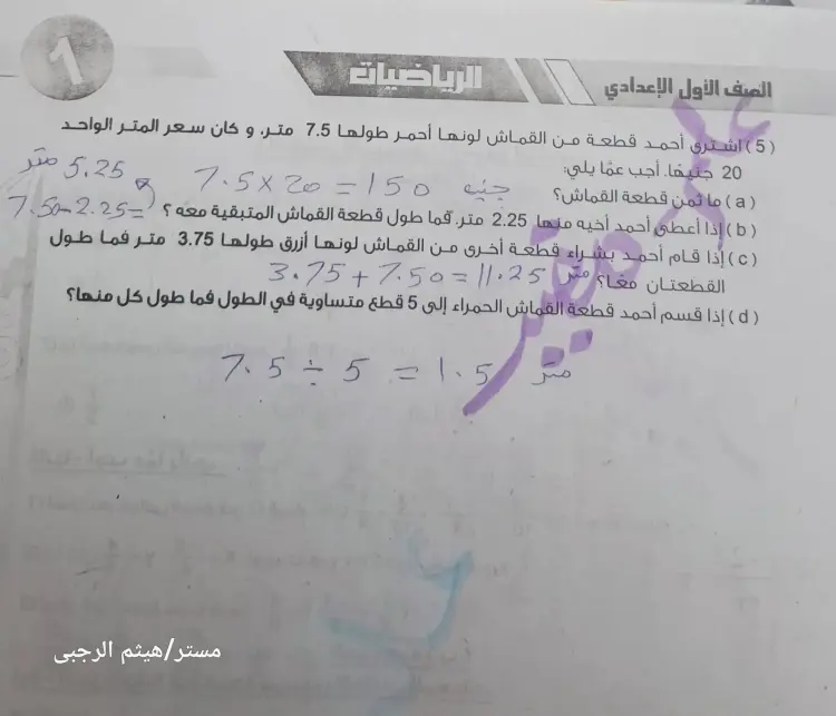 السؤال: اشترى أحمد قطعة من القماش لونها أحمر طولها 7.5 متر، وكان سعر المتر الواحد 20 جنيهًا. ما ثمن قطعة القماش؟