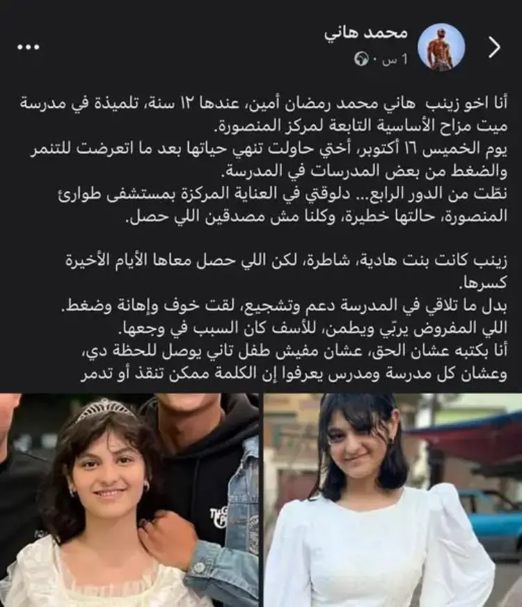ونشر شقيقها محمد هاني، تفاصيل الواقعة عبر مواقع التواصل الاجتماعي، مؤكدا أن أسرته ما زالت في حالة صدمة وذهول من الحادث الذي هز المنصورة، وكانت الطالبة زينب تدرس في مدرسة ميت مزاح للتعليم الأساسي، ومعروفة بين زملائها ومعلميها بهدوئها واجتهادها، إلا أن الأيام الأخيرة شهدت معاناتها من مضايقات وضغط نفسي من بعض المدرسات، وفقًا لشهادة شقيقها.