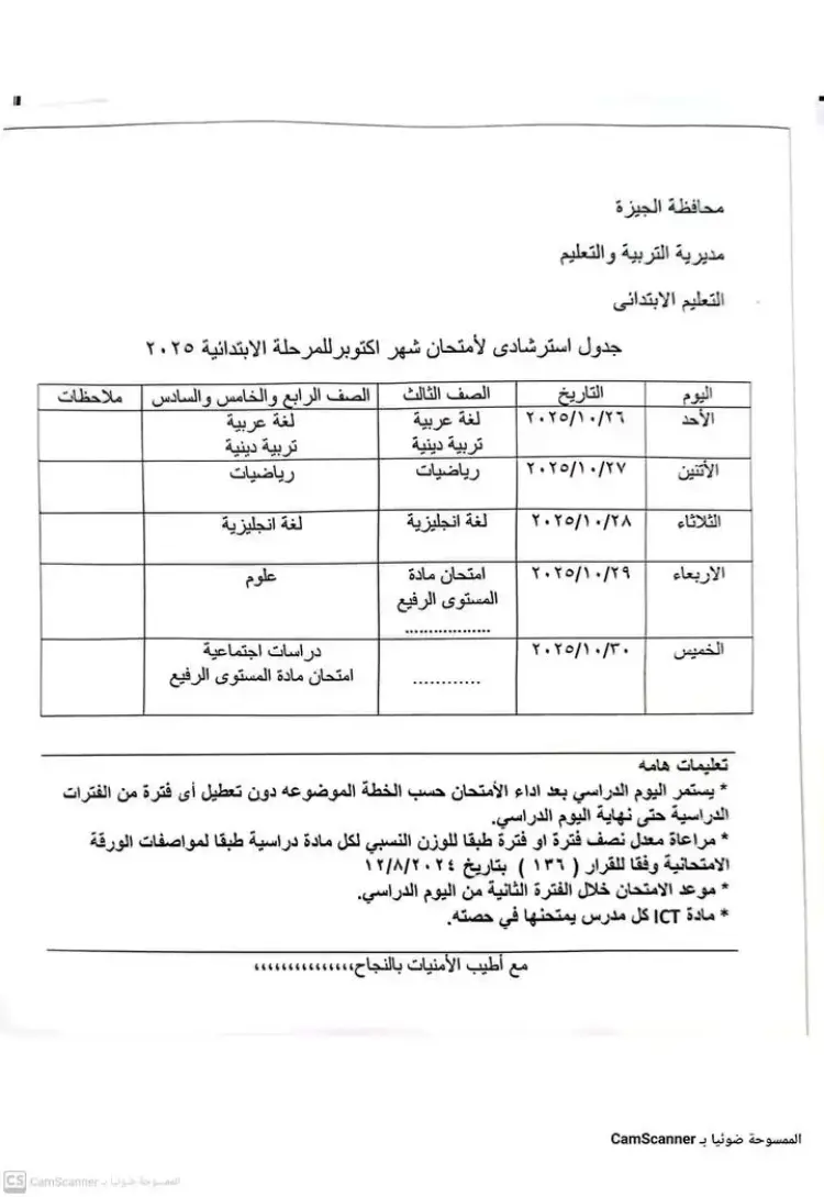 جدول امتحانات شهر أكتوبر رابعة ابتدائي محافظة الجيزة 2025