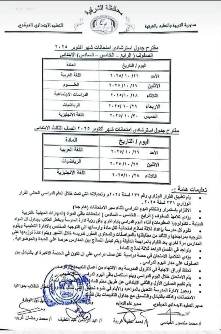 تعليمات سير العملية الامتحانية بشهر أكتوبر في الشرقية