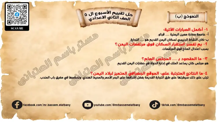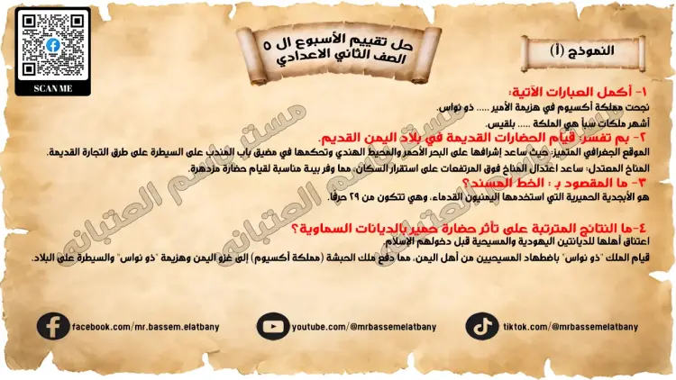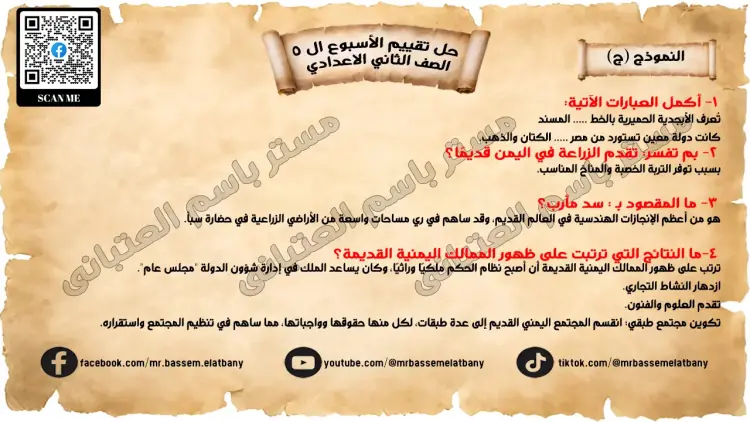 ينشر شبابيك حل الأداء الصفي وواجب وتقييم الأسبوع الخامس دراسات للصف الثاني الإعدادي ترم أول 2026.