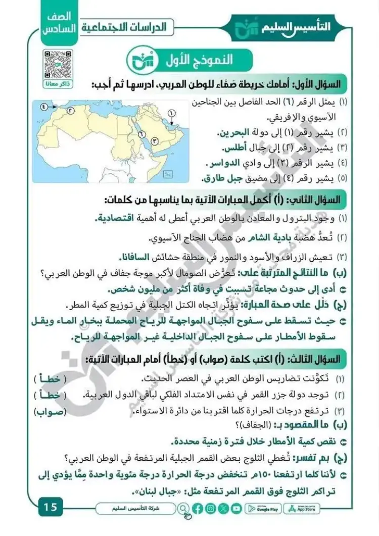 • السؤال: اكتب كلمة (صواب) أو (خطأ) أمام العبارة: يشير الرقم (2) إلى جبال أطلس.
