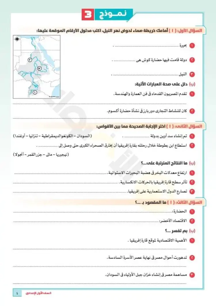 السؤال الأول: (أ) أمامك خريطة صماء لحوض نهر النيل، اكتب مدلول الأرقام الموقعة عليها: