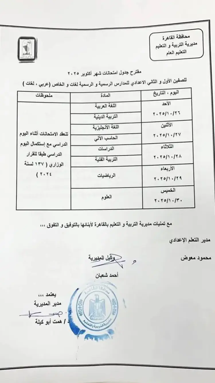 الجدير بالذكر، أن امتحانات شهر أكتوبر الصف الأول الإعدادي 2025 محافظة القاهرة ستنعقد خلال اليوم الدراسي دون الإخلال به.