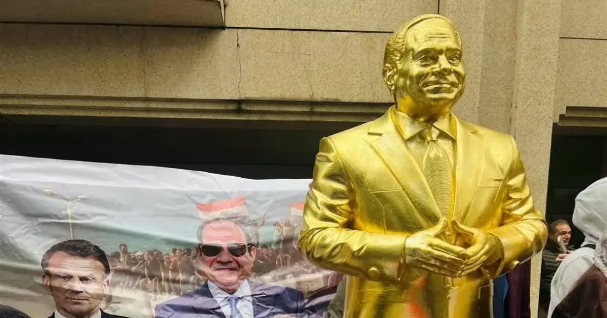 وظهر خلف تمثال السيسي الذهبي لافتة كُتب عليها «السيسي أنقذ القضية»، في إشارة إلى دور مصر في التوصل لاتفاق وقف الحرب في غزة خلال قمة السلام التي استضافتها شرم الشيخ مؤخرا.