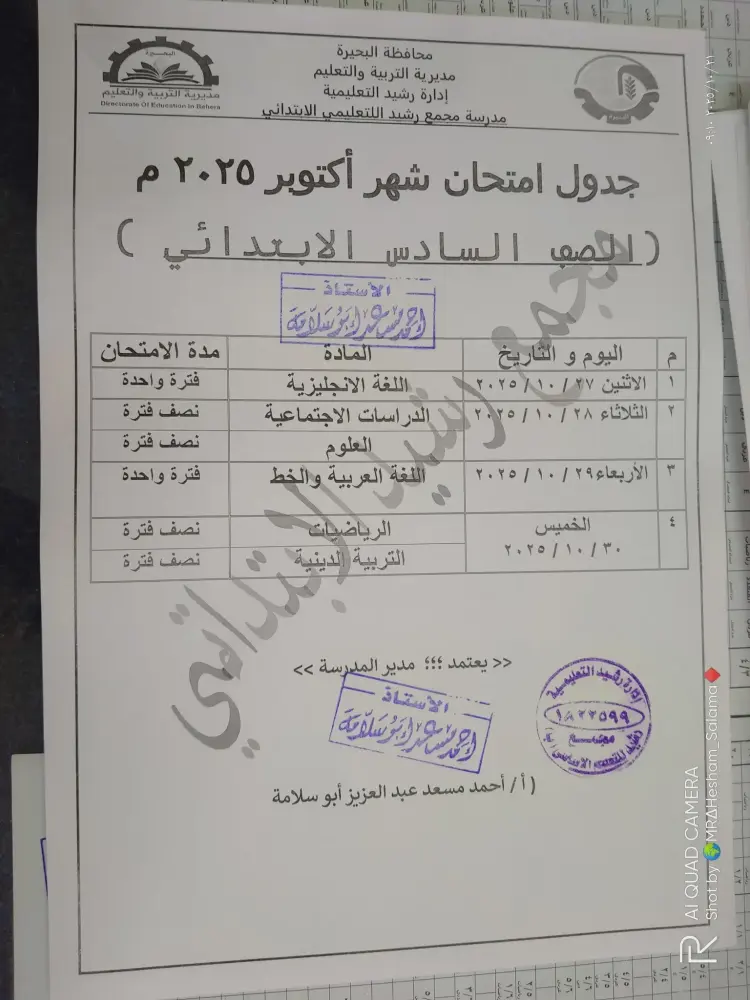 جدول امتحانات شهر أكتوبر الصف السادس البحيرة 2025