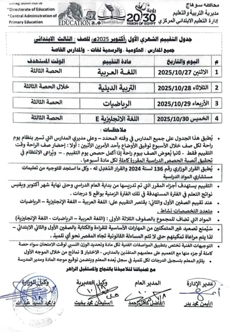 جدول امتحانات شهر أكتوبر تالتة ابتدائي محافظة سوهاج 2025