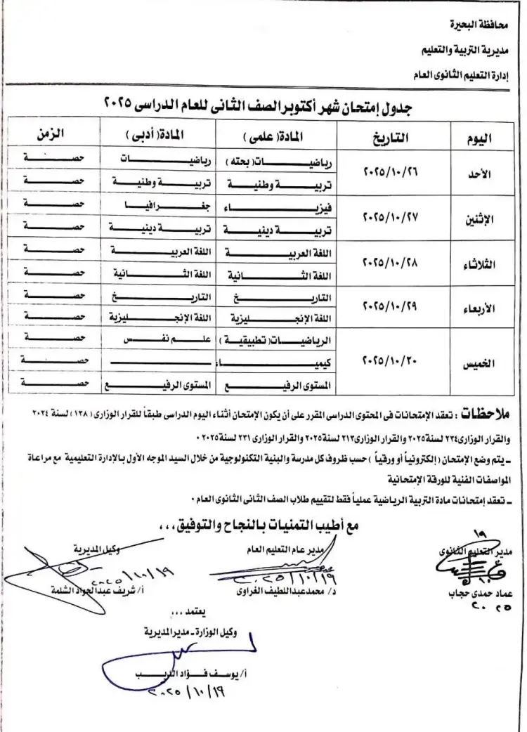 أعلنت إدارة التعليم الثانوي العام بمديرية التربية والتعليم بمحافظة البحيرة عن جدول امتحان شهر أكتوبر للصف الثاني الثانوي للعام الدراسي 2025 2026، للشعبتين العلمية والأدبية.