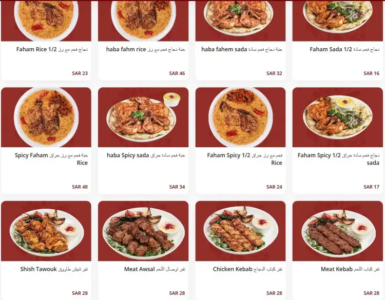 دجاج فحم حبة مع رز حراق: دجاجة كاملة مشوية على الفحم بخلطة حارة مع الأرز بسعر 48 ريال.