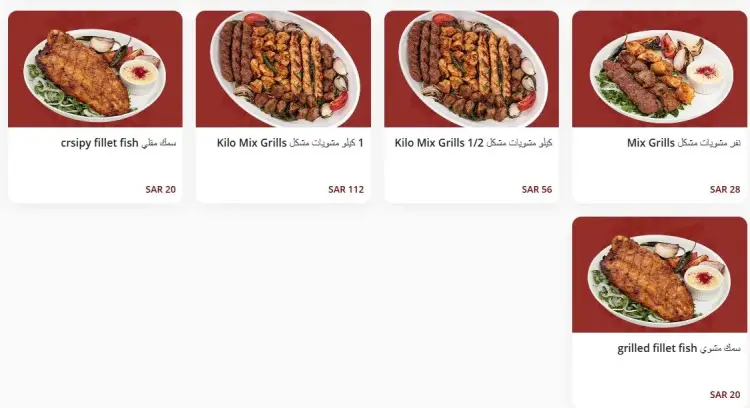 كيلو مشويات مشكل: 1 كيلو من مزيج الكباب، الأوصال، وشيش طاووق بسعر 112 ريال.