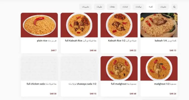 كبسة مع رز: ربع دجاجة مطهوة بأسلوب الكبسة مع الأرز بسعر 13 ريال.