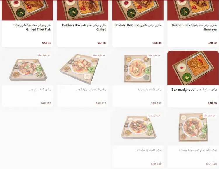 بوكس بخاري دجاج فحم: دجاج فحم مع أرز بخاري ومرتبات في صندوق بسعر 38 ريال.