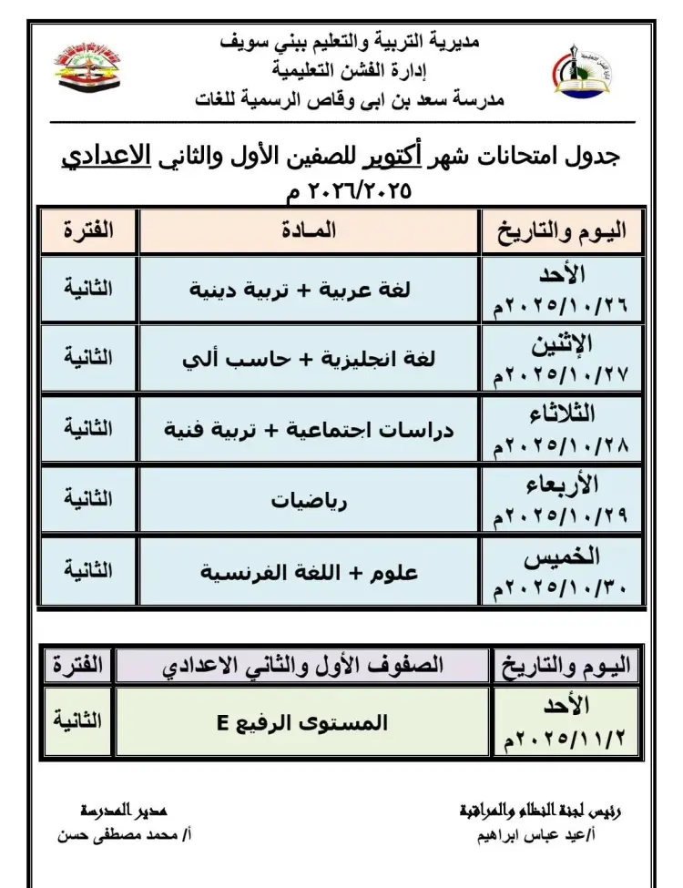 جدول امتحانات شهر أكتوبر الصف الأول الإعدادي 2025 بني سويف