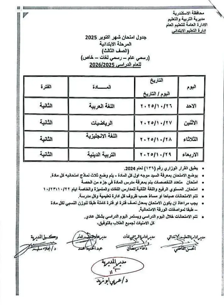 جدول امتحانات شهر أكتوبر ثالثة ابتدائي بالإسكندرية 2026