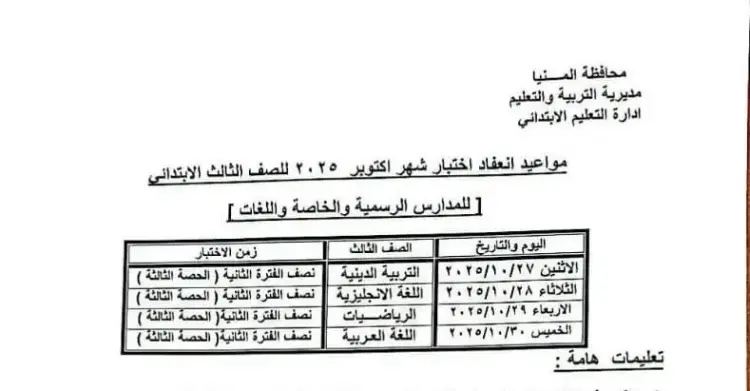 جدول امتحانات شهر أكتوبر الصف الثالث الابتدائي 2025 المنيا