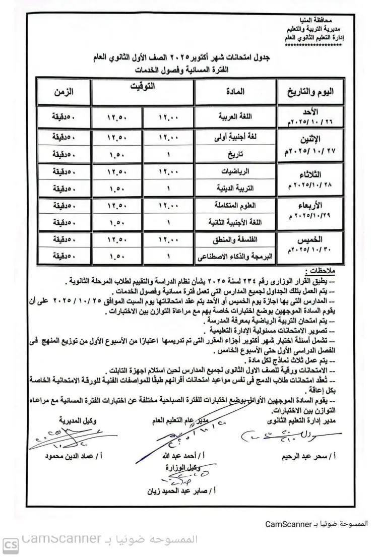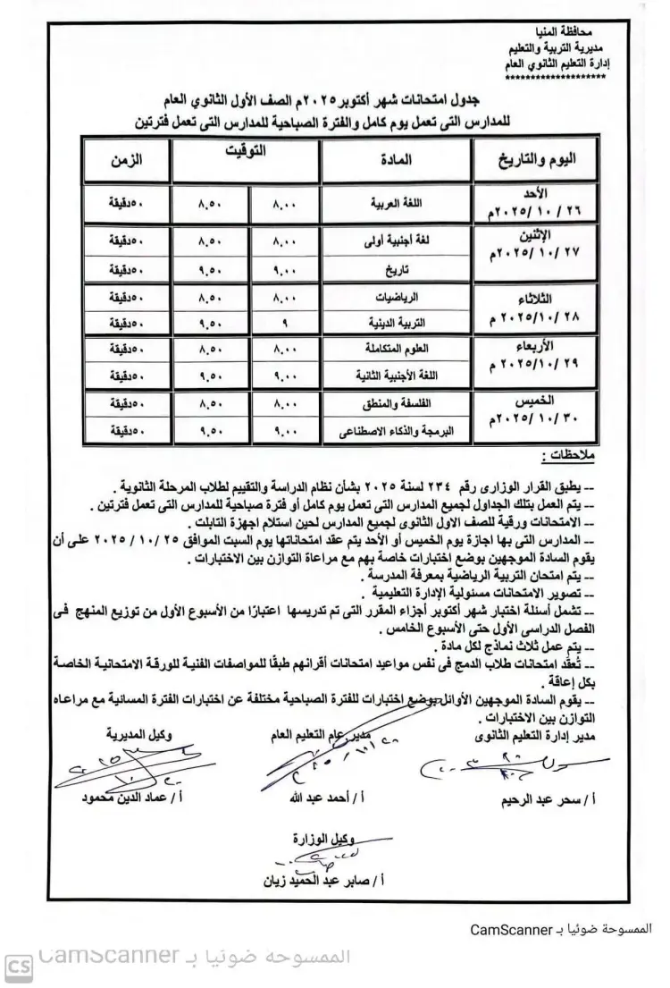 جدول امتحانات شهر أكتوبر أولى ثانوي محافظة المنيا 2025