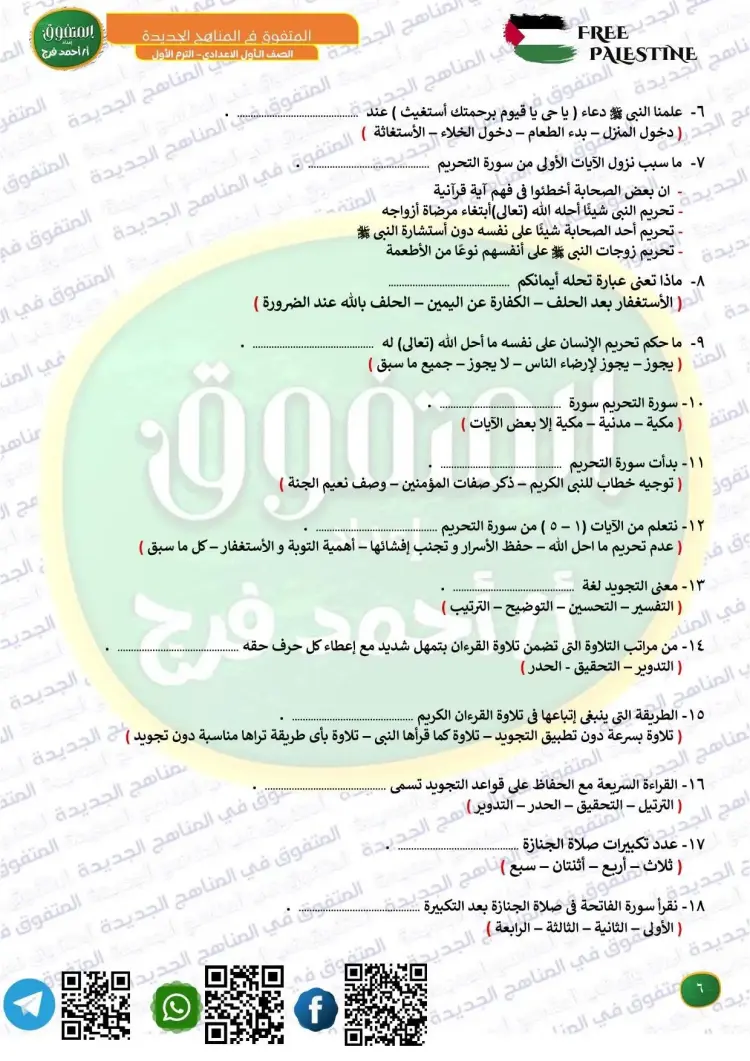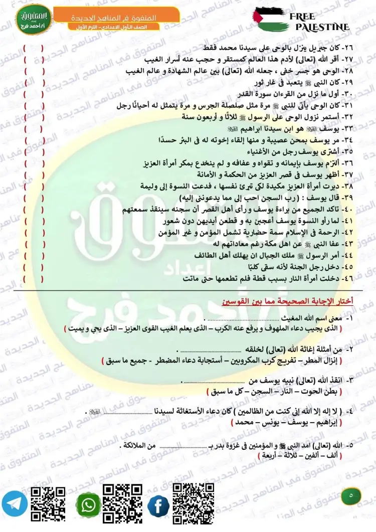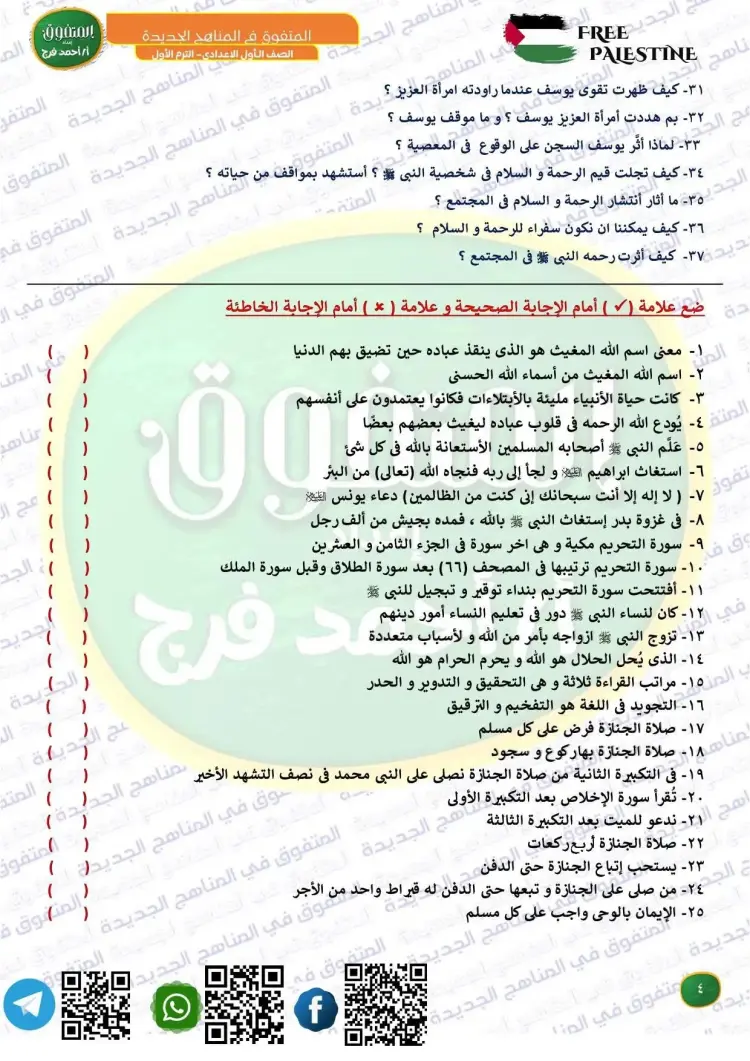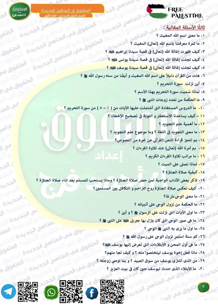 جاءت أسئلة المتفوق دين للصف الأول الإعدادي شهر أكتوبر 2025 2026 على النحو التالي: