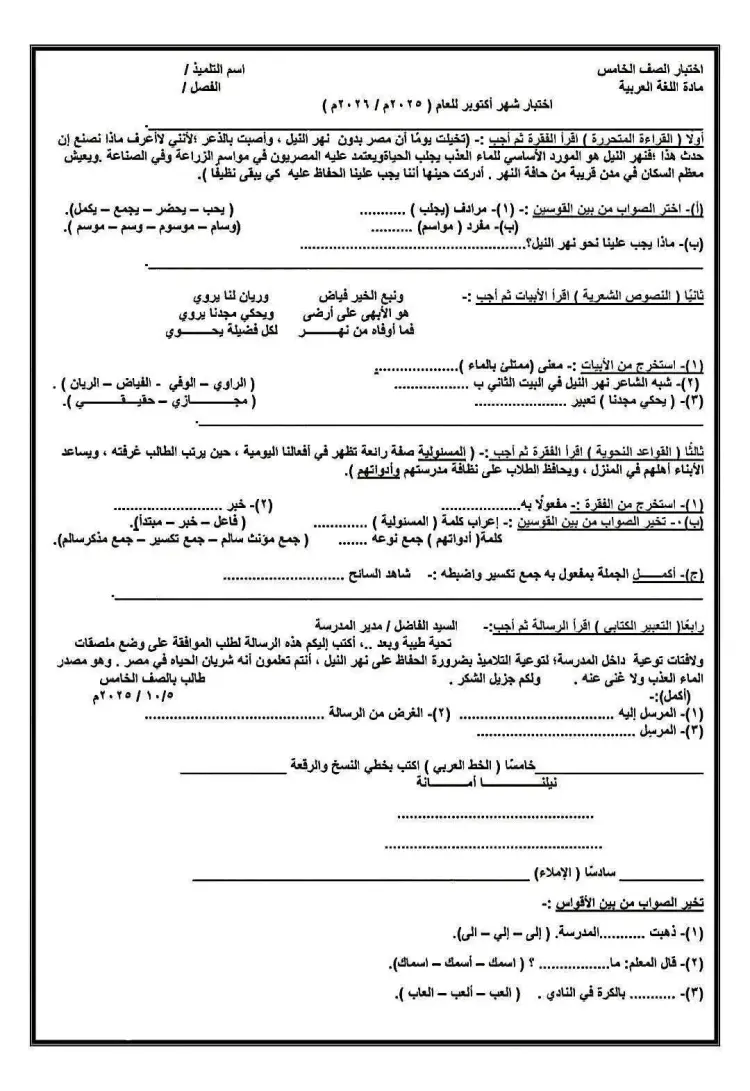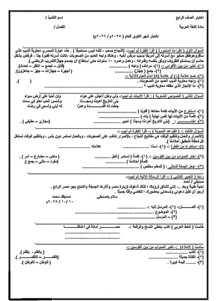نموذج استرشادي لامتحان لغة عربية شهر أكتوبر 2025 جميع الصفوف الابتدائية