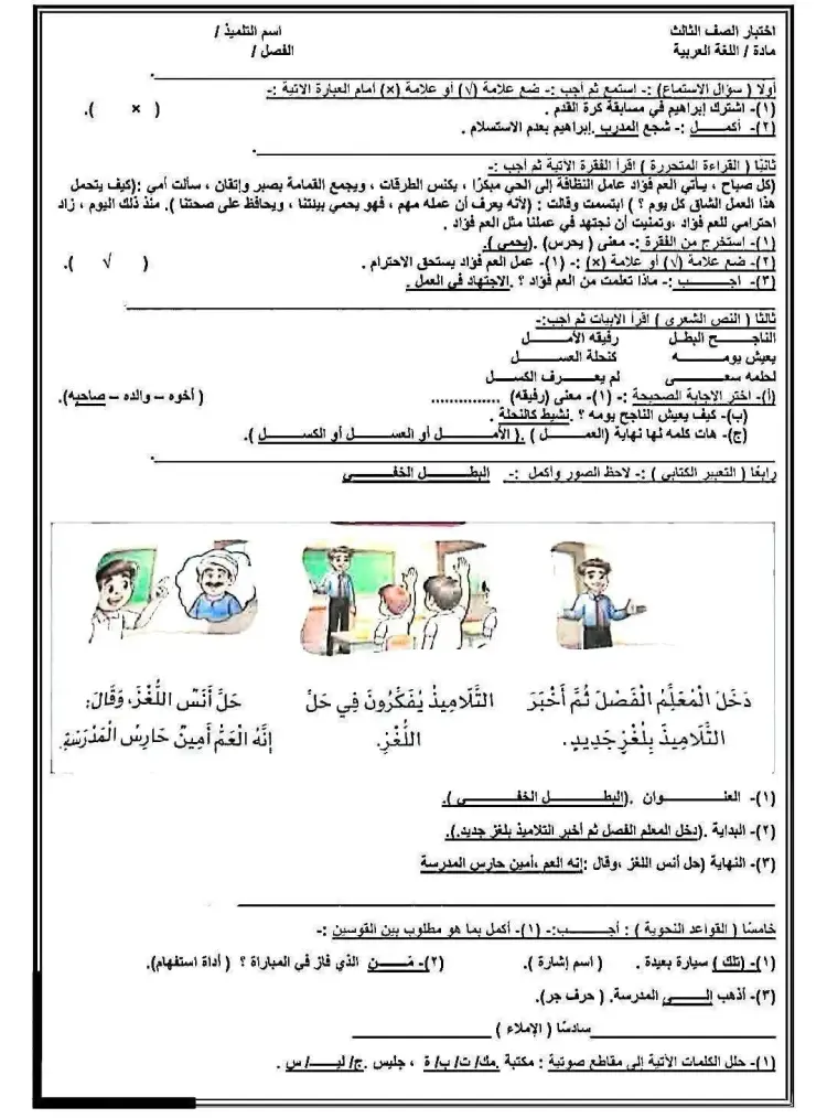 ونستعرض فيما يلي إحدى نماذج الامتحانات لصفوف المرحلة الابتدائية، حيث تغطي معظم النماذج موضوعات القراءة والنحو والإملاء، بطريقة مبسطة ومناسبة للفئات العمرية الصغيرة.