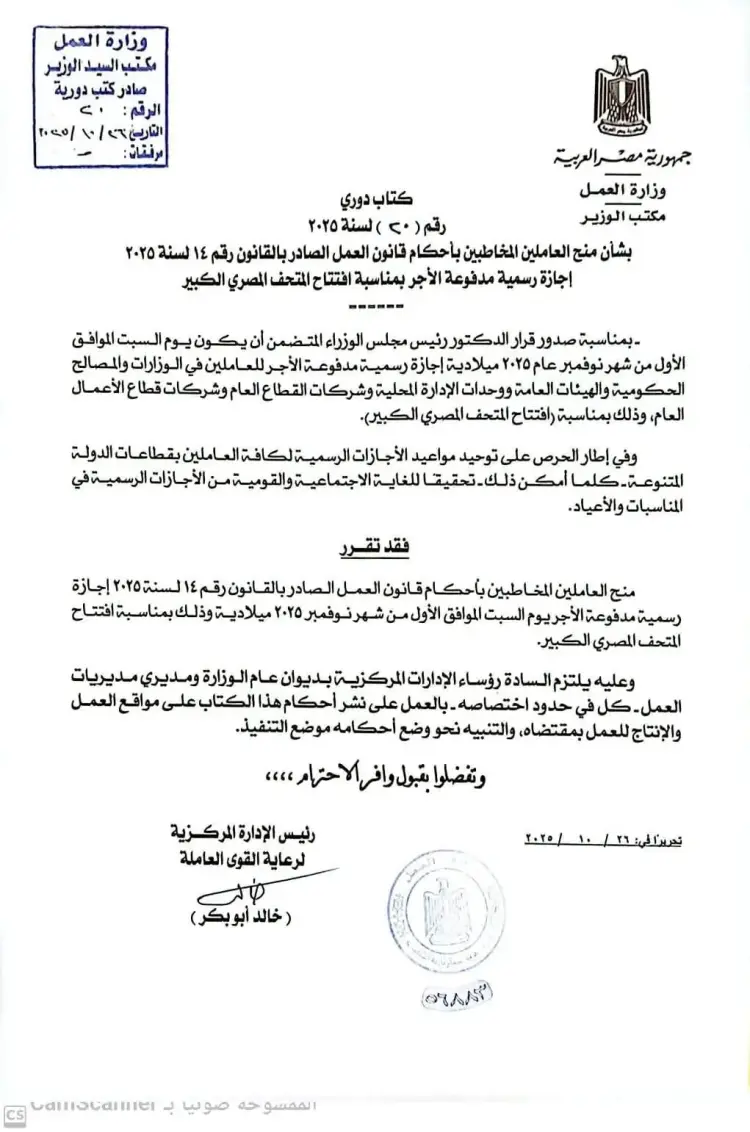 أصدرت وزارة العمل بيانا رسميا، اليوم الأحد الموافق 26 أكتوبر 2025، تعلن فيه اعتبار يوم السبت المقبل، الموافق 1 نوفمبر 2025، إجازة رسمية مدفوعة الأجر لجميع العاملين في القطاع الخاص، وذلك بمناسبة افتتاح المتحف المصري الكبير.