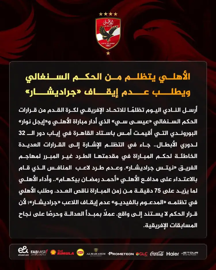 جاء تظلم النادي الأهلي حول مجموعة من القرارات التي وصفها النادي بالخاطئة والمؤثرة، مطالبا بضرورة عدم إيقاف اللاعب نيتس جراديشار عقب طرده المثير للجدل.