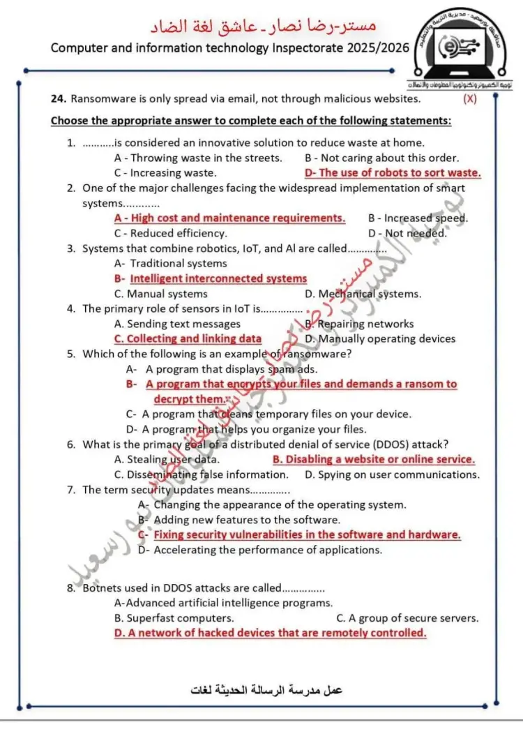 واشتملت مذكرة مراجعة شهر أكتوبر في مادة تكنولوجيا المعلومات والاتصالات بالانجليزي ict لطلاب الصف الثاني الإعدادي بالعام الدراسي 2025 2026، على العديد من الأسئلة منها ما يلي: