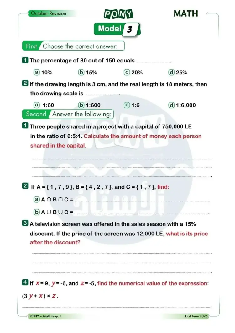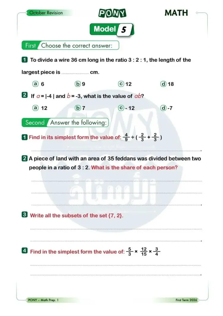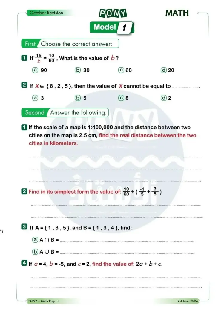 امتحانات شهر أكتوبر math للصف الأول الإعدادي 2026 بالإجابات