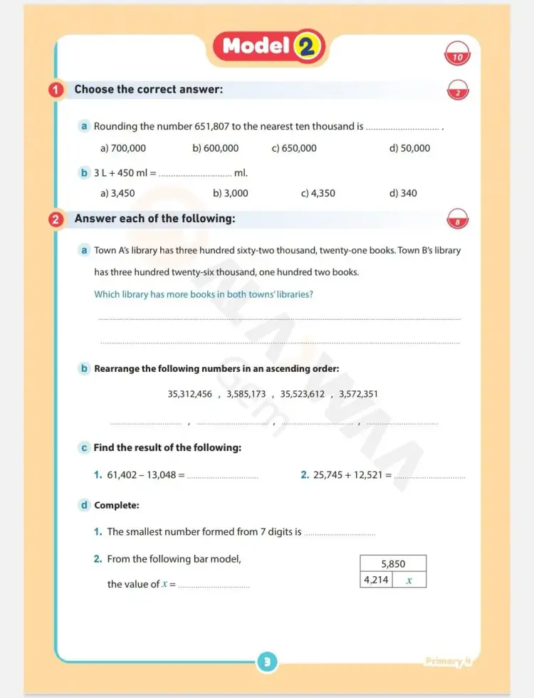 b) 3 L + 450 ml = ................ ml. (a) 3,450 (b) 3,000 (c) 4,350 (d) 340