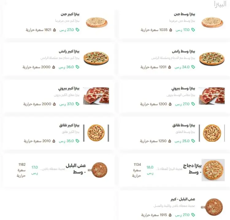 • بيتزا ببروني (كبير): 37.0 ر.س (2000 سعرة حرارية)