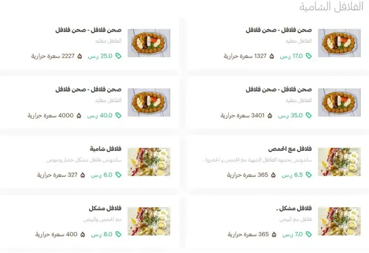 • صحن فلافل (كبير جداً): 40.0 ر.س (4000 سعرة حرارية)
