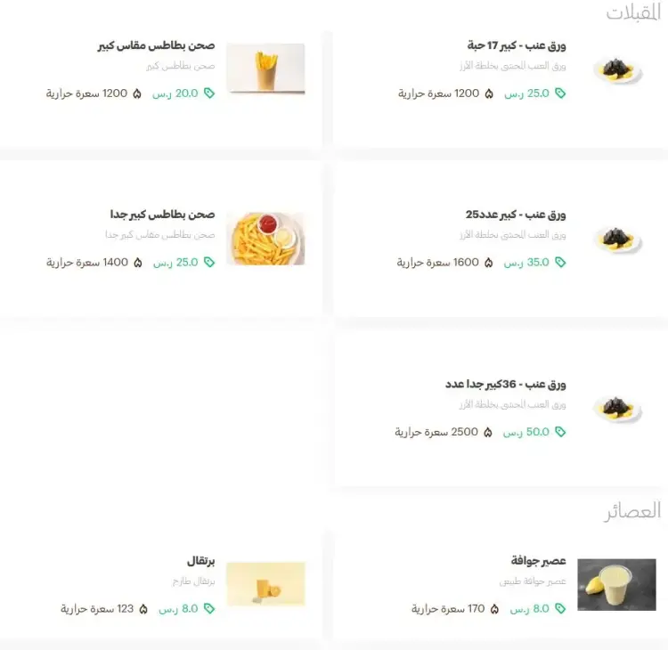• ورق عنب (كبير جداً 36 حبة): 50.0 ر.س (2500 سعرة حرارية)