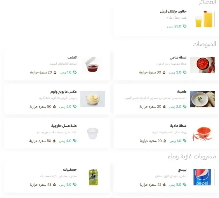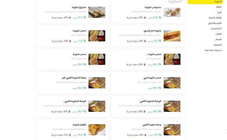 • وجبة الشاورما العربي: 26.0 ر.س (265 سعرة حرارية)