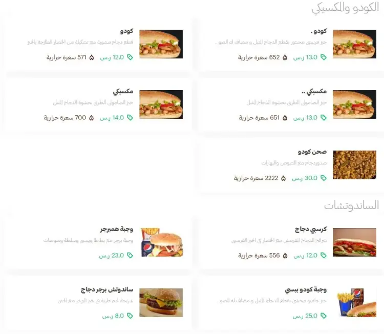 • ساندوتش كودو (خبز فرنسي): 13.0 ر.س (652 سعرة حرارية)
