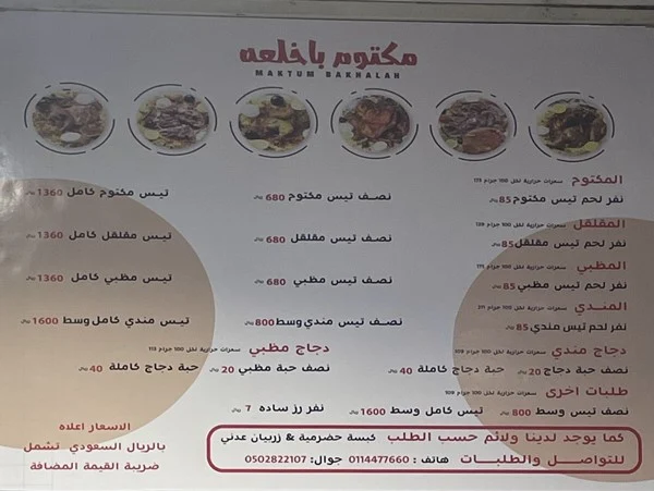 تيس مكتوم كامل: وجبة تيس كامل مطهوة بأسلوب المكتوم. السعر: 1360 ر.س.