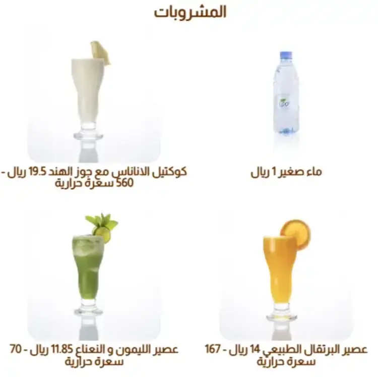 مشروب عصير البرتقال الطبيعي يحتوي على 167 سعرة حرارية بسعر 14 ريال.