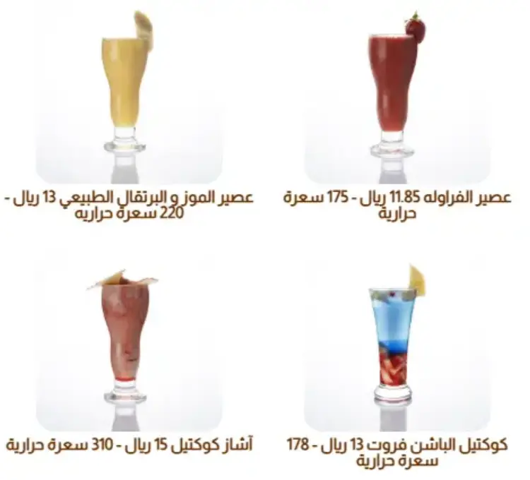 مشروب كوكتيل الفراوله يحتوي على 165 سعرة حرارية بسعر 19 ريال.