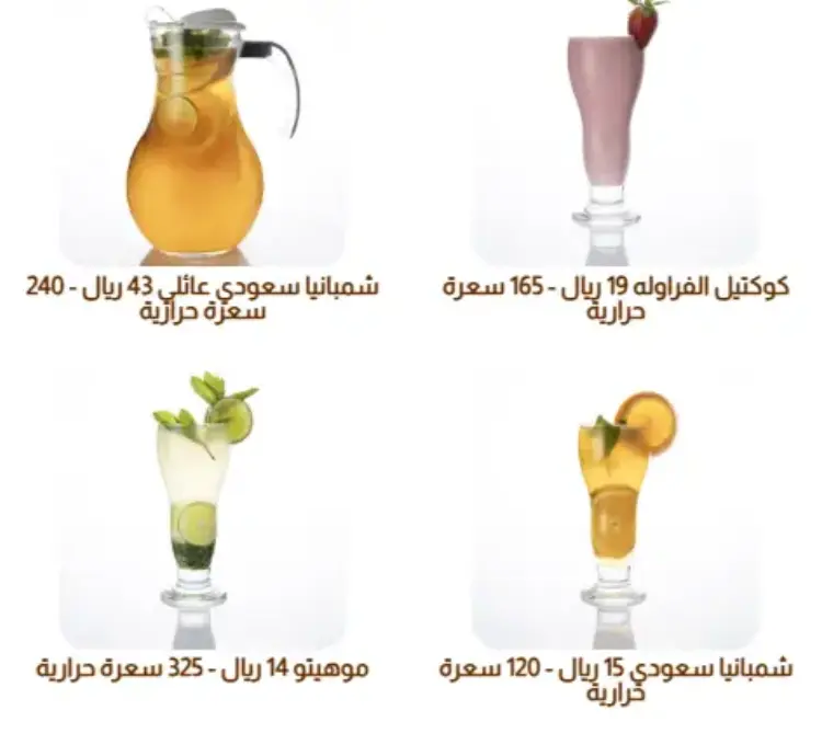 مشروب موهيتو يحتوي على 325 سعرة حرارية بسعر 14 ريال.