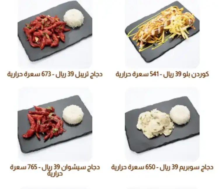 طبق دجاج التشيلي يحتوي على 650 سعرة حرارية بسعر 39 ريال.