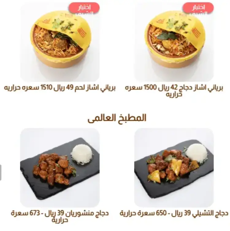 طبق برياني اشاز دجاج (اختيار الشيف) يحتوي على 1500 سعرة حرارية بسعر 42 ريال.