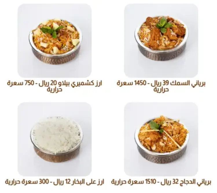 طبق ارز البرياني يحتوي على 435 سعرة حرارية بسعر 15 ريال.
