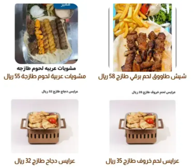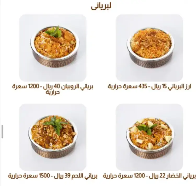 طبق برياني اللحم يحتوي على 1500 سعرة حرارية بسعر 39 ريال.