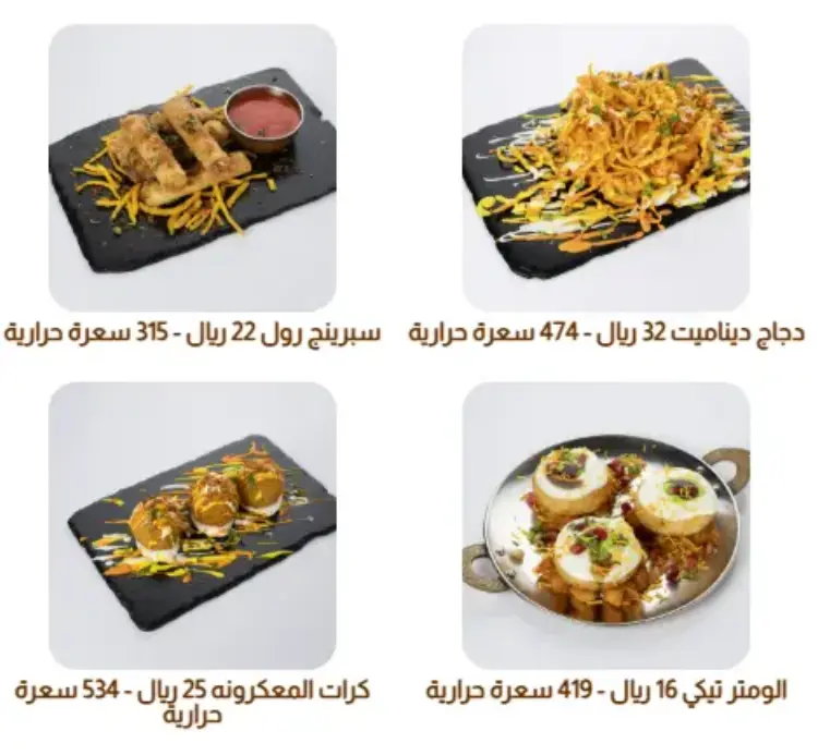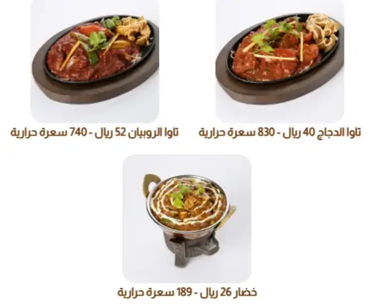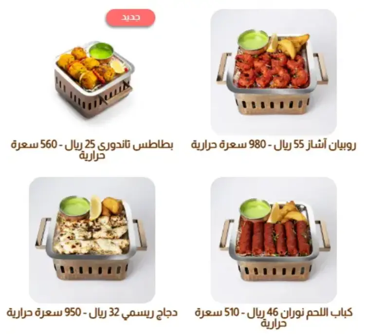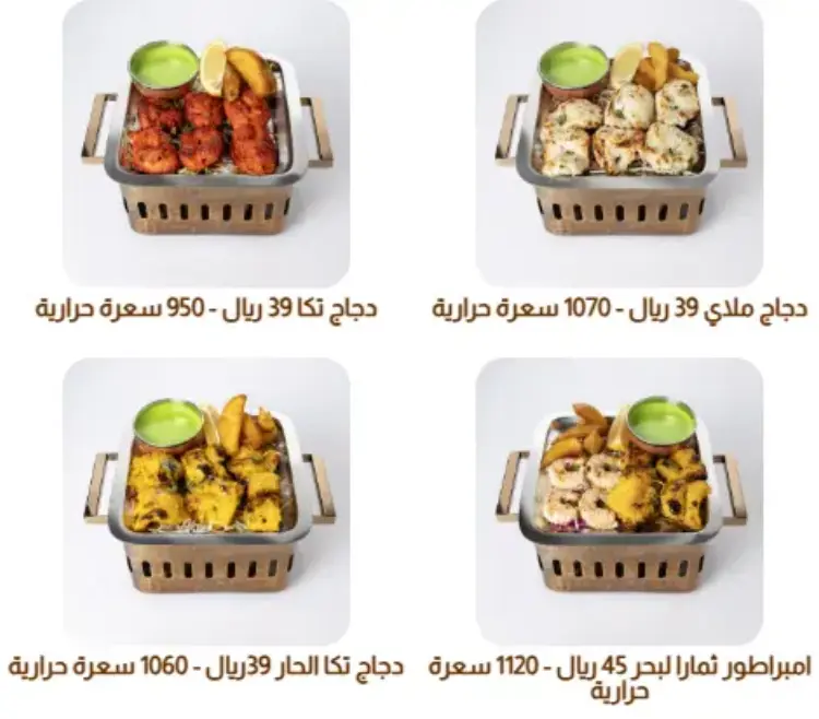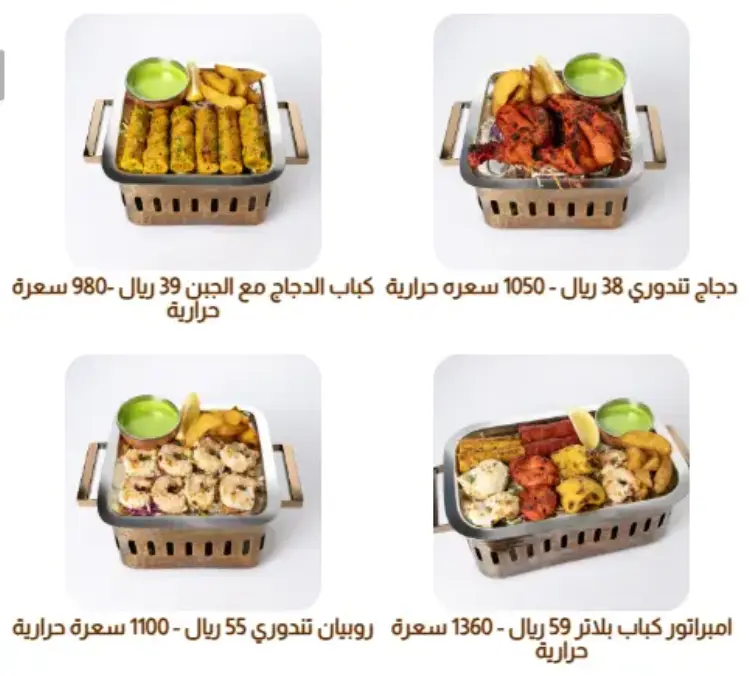 طبق دجاج تندوري يحتوي على 1050 سعره حرارية بسعر 38 ريال.