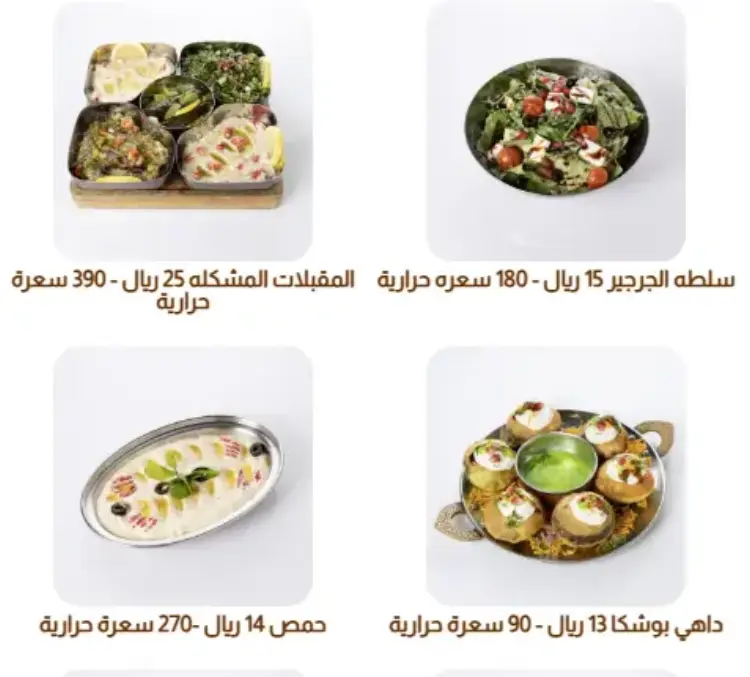 طبق المقبلات المشكله يحتوي على 390 سعرة حرارية بسعر 25 ريال.