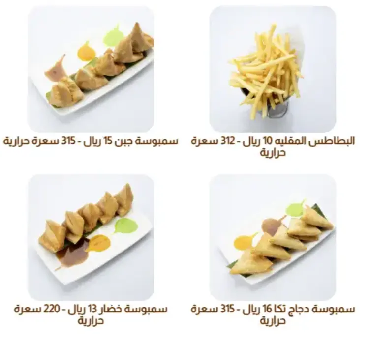 طبق سمبوسة جبن يحتوي على 315 سعرة حرارية بسعر 15 ريال.