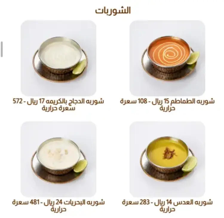 طبق شوربه الدجاج بالكريمه يحتوي على 572 سعرة حرارية بسعر 17 ريال.