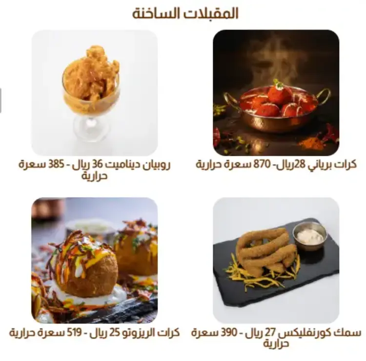 طبق روبيان تندوري يحتوي على 1100 سعرة حرارية بسعر 55 ريال.