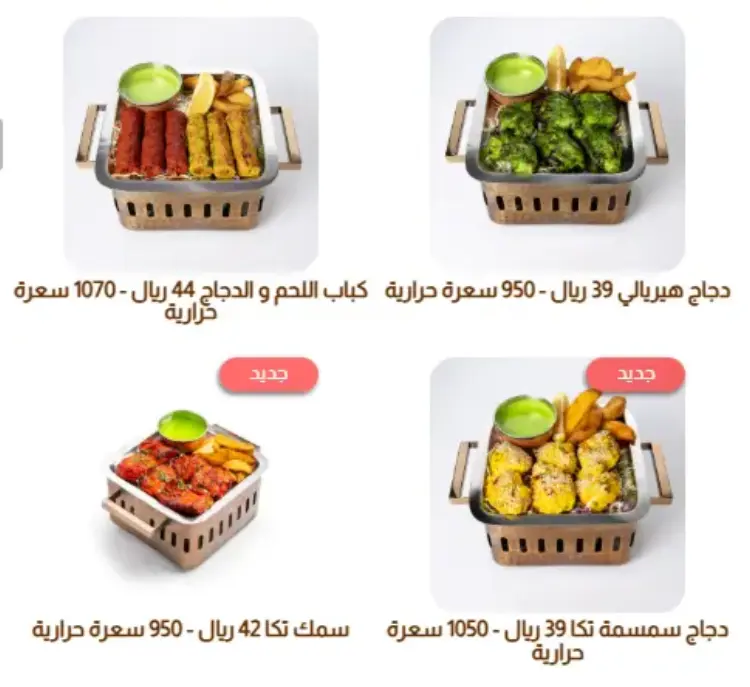 طبق دجاج تكا يحتوي على 950 سعرة حرارية بسعر 39 ريال.
