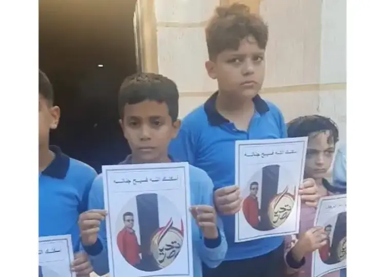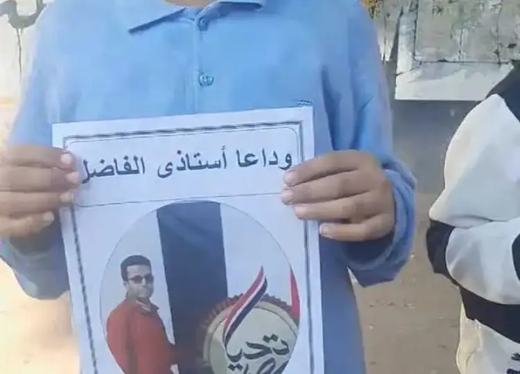 بالبكاء والدموع.. تلاميذ بالشرقية يودعون معلمهم بعد وفاته حاملين صوره