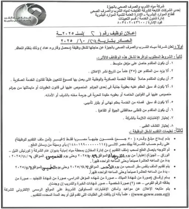 يأتي هذا الإعلان في إطار سعي الشركة لتعزيز كوادرها البشرية، لضمان استمرارية الخدمات المقدمة للمواطنين في محافظتي الجيزة والقاهرة.