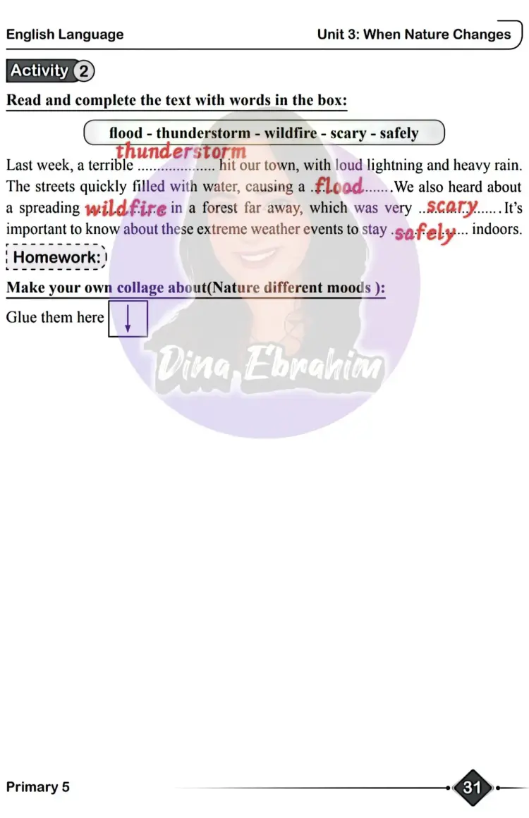 الإجابة: (مطلوب من الطالب عمل «كولاج» أو لصق صور تعبر عن حالات الطبيعة المختلفة في المربع المخصص).